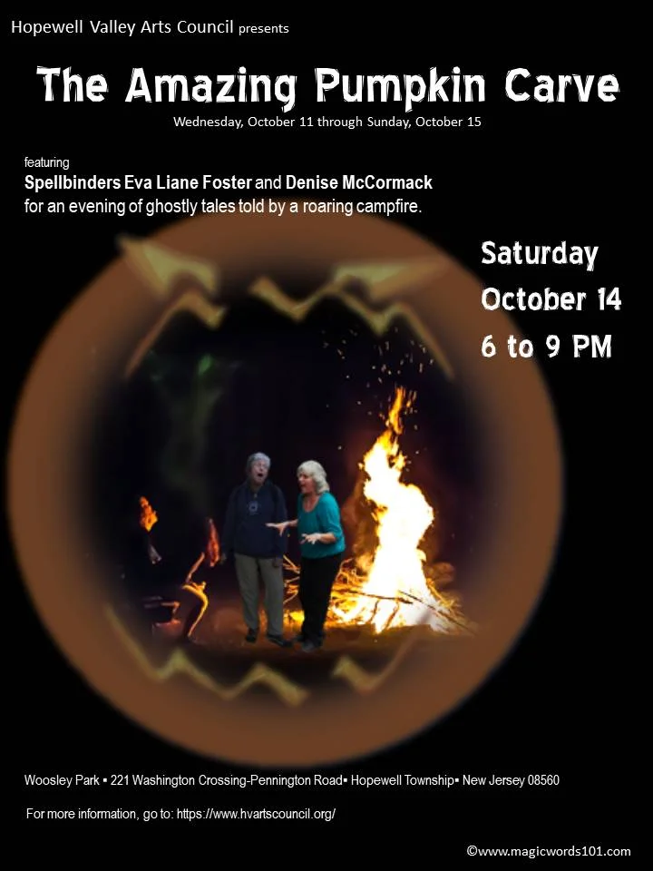 Storytellers Eva Liane Foster and Denise McCormack spin tales to thrill and chill for the whole family during the Saturday night bonfire of Hopewell Valley Arts Council Amazing Pumpkin Carve.