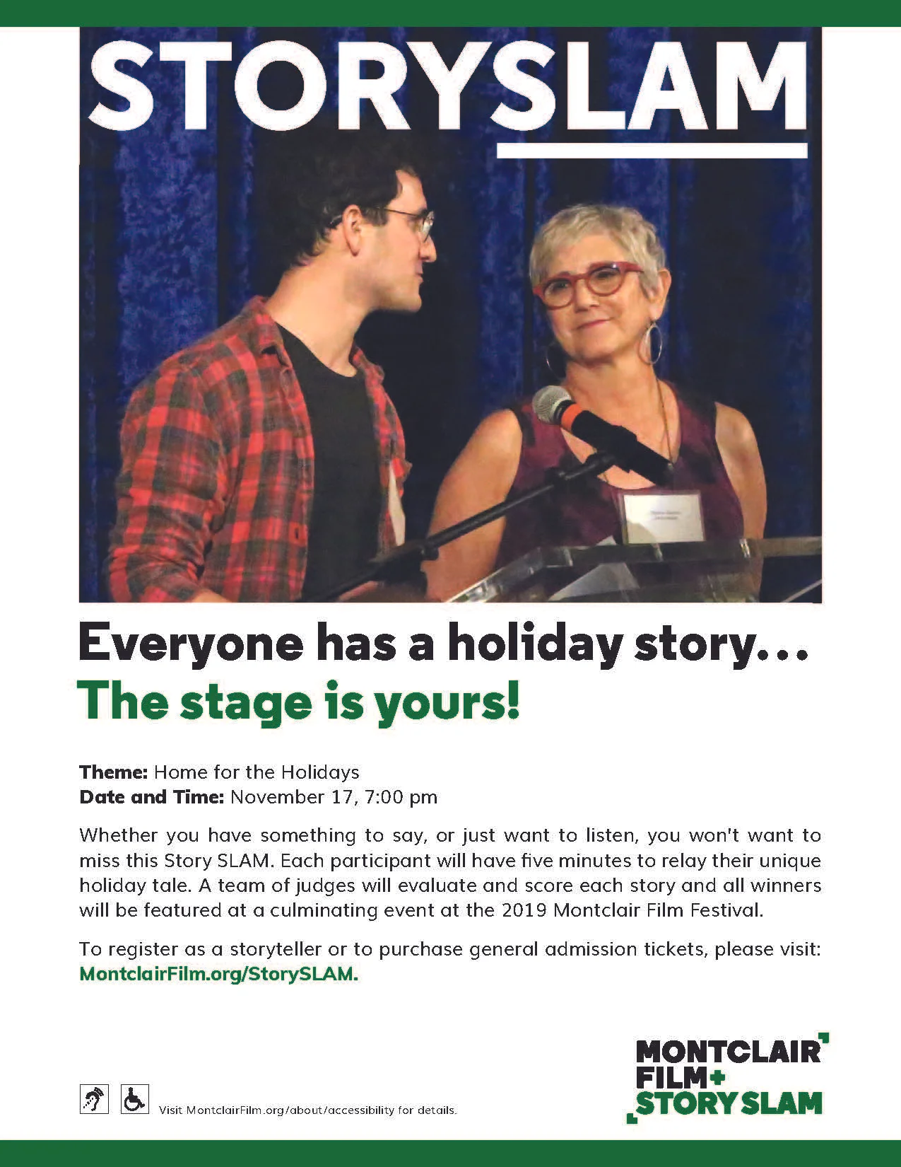 Montclair Film's 2nd season of StorySLAM is not to be missed! November's theme is Home for the Holidays and each storyteller has 5 minutes to relay their unique version of the theme. All storytellers receive a S'Well bottle and the winner will receive a special gift.