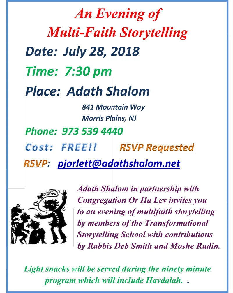 An evening of multi-faith storytelling done by a troupe of storytellers, including Rabbi Debra Smith and Rabbi Moshe Rudin, from the Transformational Story Telling School which is based out of NY.